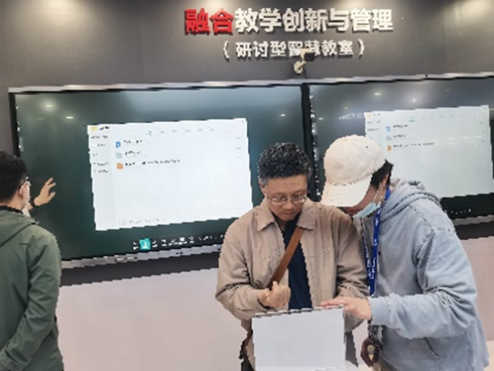 两位老师在参会期间,参观了希沃、基理科技、蓝鸽科技、力扑智能、英佳、锐捷等展台,详细了解了“希沃实验实训教学解决方案”;基理科技“高校实验室安全信息化管理解决方案”;蓝鸽科技“X86云网络智慧教室建设方案”,“一室多用云网络智慧教室建设方案”;力扑智能“智慧教室终端”;英佳“智慧教室系统”;锐捷“研讨型智慧教室”等高校智慧型教室和实验室建设方案,并与相关展商工作人员进行了探讨和交流。
