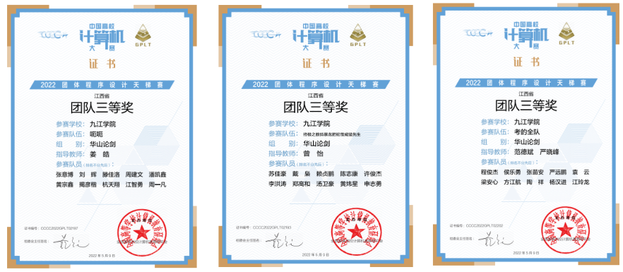 团体程序设计天梯赛旨在考察学生的团队综合程序设计能力和实战配合默契程度。2022年度,计算机学院选拔出30名学生组成三个参赛队(每队10人),参加了团体程序设计天梯赛——“华山论剑”组别的团队竞赛。在此次竞赛中,选手们发挥出色、表现优异,勇夺江西省团队三等奖3项。