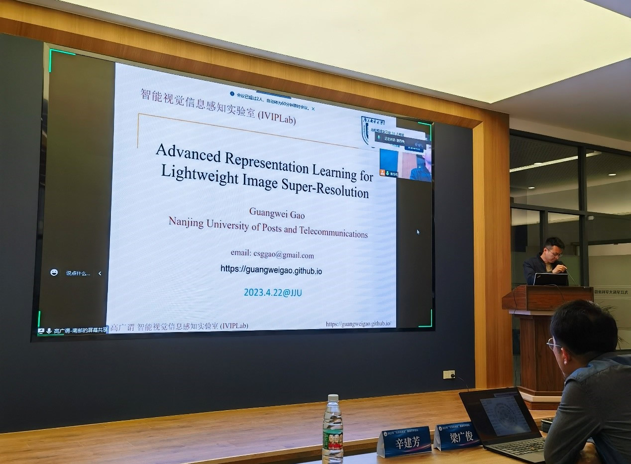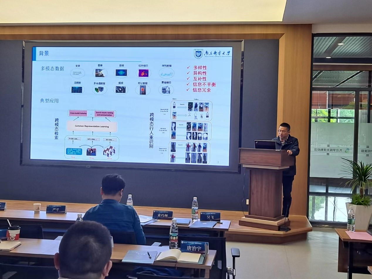 专家报告精彩,交流讨论热烈。南京林业大学教授业巧林作了《面向森林生态安全的视觉理解》的报告,介绍了面向森林生态安全的视觉特征表示与识别理论方法,以及在重要林草领域的推广应用路径;南京邮电大学研究员高广谓作了《用于轻量级图像超分辨率的高级表征学习》的报告,介绍了研究团队在轻量级图像超分辨率研究领域中高级表征学习方向的近期研究进展及落地应用情况;江苏警官学院副教授梁广俊作了《元宇宙安全初探》报告,介绍了元宇宙、元宇宙与我们人类的关系,以及元宇宙的安全问题等研究方向;南京邮电大学副教授吴飞作了《多模态学习方法与应用》的报告,介绍了课题组近几年围绕计算机视觉典型应用所设计的多模态学习模型;南京邮电大学副教授辛建芳作了《数字孪生研究进展及在铁路智能运维中的应用》报告,探讨了基于数字孪生的铁路基础设施的智能运维技术框架,以及应用中存在的问题和解决方案。