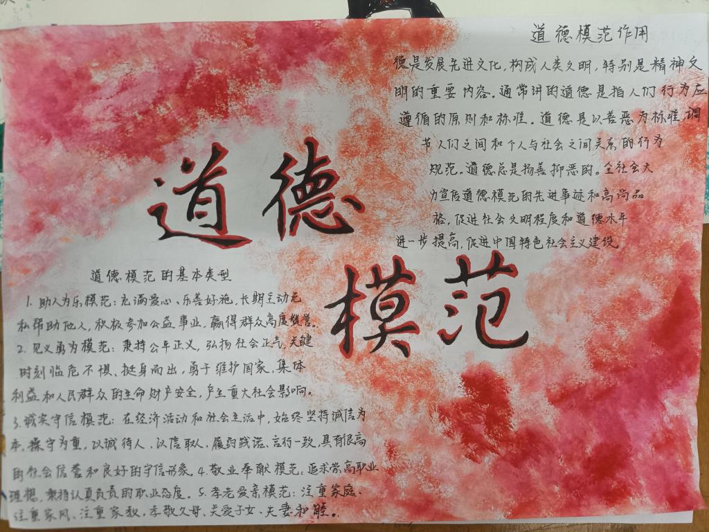活动中,同学们积极参与,用自己的智慧和巧手创作出一张张精美的手抄报,通过在收集相关资料和制作手抄报的过程进一步加强了对道德模范相关事迹的认识与学习。许多作品不仅图文并茂,而且书写美观,标题醒目突出,内容也十分生动,他们用最真实的情感,充分展示了向道德模范学习的积极性。