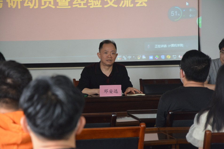 彭虎对考研同学们提出几点期望:1、考研目标要清晰2、备考期间要劳逸结合3、重点突破弱势学科,保持强势学科优势4、意志力要坚定。在考研经验交流环节,计算机学院2022届考研成功的优秀毕业生张裕良叶鹏两位同学就备考经验与方法为现场同学进行了详细的分享