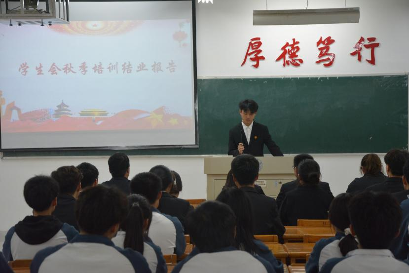 紧接着由学生会办公室主任廖誉文回顾和总结这些天以来所学的工作技巧和思想理论,他希望大家能够以全心全意为同学们服务为宗旨,各部门携手共进,相互配合,将接下来学院的各项工作越做越好。最后他宣布学生会秋季培训班正式结业。