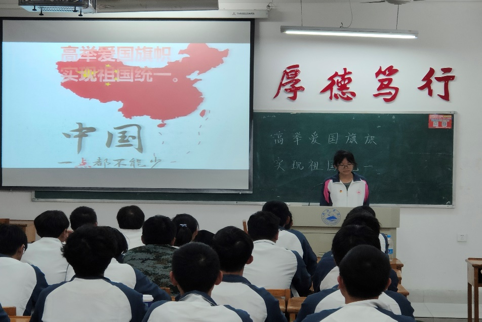 为弘扬爱国精神,维护国家统一,提高同学们的国家统一意识,11月3日,计算机学院于文友楼各班教室开展“高举爱国旗帜,实现祖国统一”主题团日活动,活动由各班团支书主持,全体大一学生参加。