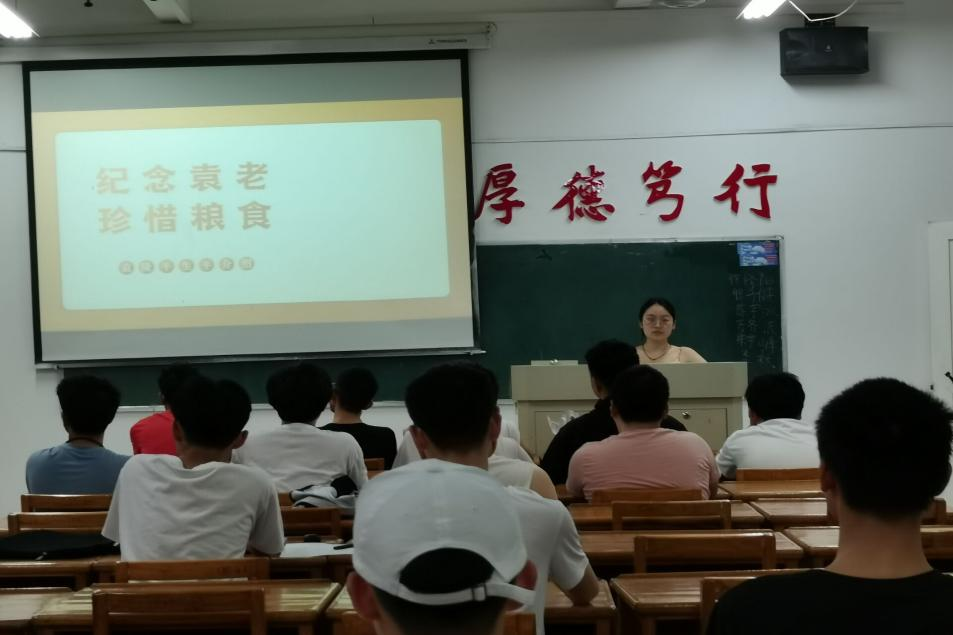 活动伊始,各班团支书向同学们简单介绍了袁隆平老先生一生的功绩,享誉海内外的著名农业科学家,我国杂交水稻事业的开创者和领导者“共和国勋章”获得者,中国工程院院士等,很难想象如此多的头衔竟是加诸同一人身上,在静静聆听的同时,所有人心中也充满了对老先生的敬意与感谢。此外,团支书还播放了有关袁老先生的视频,他的身影活跃在科研实验室,活跃在田间地头,更活跃在每一位同学的心中。