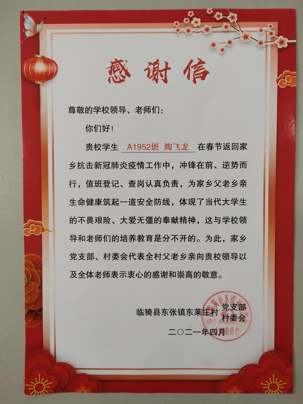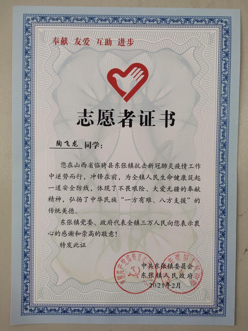 正是因为有他们在抗击新冠肺炎疫情工作中逆势而行,冲锋在前行,为家乡父老乡亲生命健康筑起一道安全防线,充分体现出当代大学生的不畏艰险、大爱无疆的奉献精神。中共东张镇委员会东张镇人民政府以及临猗县东张镇东莱庄村特向陶飞龙同学赠予感谢信和志愿者证书。