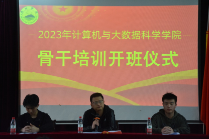 4月8日下午,计算机学院2022级大学生骨干培训班开班仪式在文理实验楼报告厅如期举行。此次开班仪式出席人员有:计算机学院思政科副科长尹志刚,21届学生团委副书记左建林、孙文芳,学生会执行主席廖誉文、汪浩民,21届团委学生会干部、2023届骨干班全体成员,活动由团委办公室主任李思鸣主持。