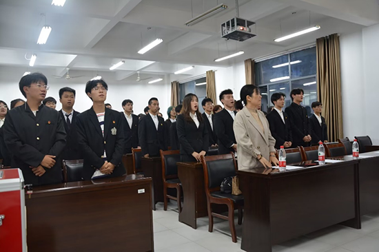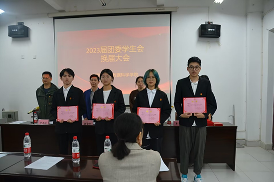 全体起立奏唱国歌,大会拉开序幕。刘欣和尹志刚分别宣读了新一届团委、学生会干部名单,并为离任的学生干部颁发聘书。