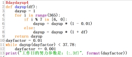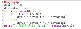 def保留字用于定义函数,这段代码可共用根据函数df参数计算工作日力量的函数,参数不同计算结果不同。while保留字判断条件是否成立,条件成立时循环执行。 |
