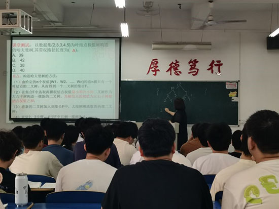 此次公开课的教学内容为哈夫曼树及其应用,闵老师采用了线上线下混合式教学方法。课前,根据学生学情在超星学习通平台发布课前预习任务单,引导学生观看视频、阅读教材,完成作业和讨论。课中通过随堂测试、投票、提问、答疑等方式,掌握学生的自学情况,并进行查漏补缺;随后通过问题导入、案例分析、情景模拟、分组讨论等教学方法,引导学生运用哈夫曼树解决“约翰修篱笆”等实际问题,并引导学生创新应用哈夫曼树解决线上布置的讨论题。